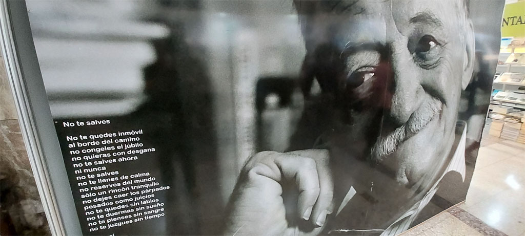 Centran la muestra las lecturas de Mario Benedetti, cuyo rostro afable se hace presente en un gran póster, y los versos primeros del poema No te salves que dicen: “no te quedes inmóvil al borde del camino”.