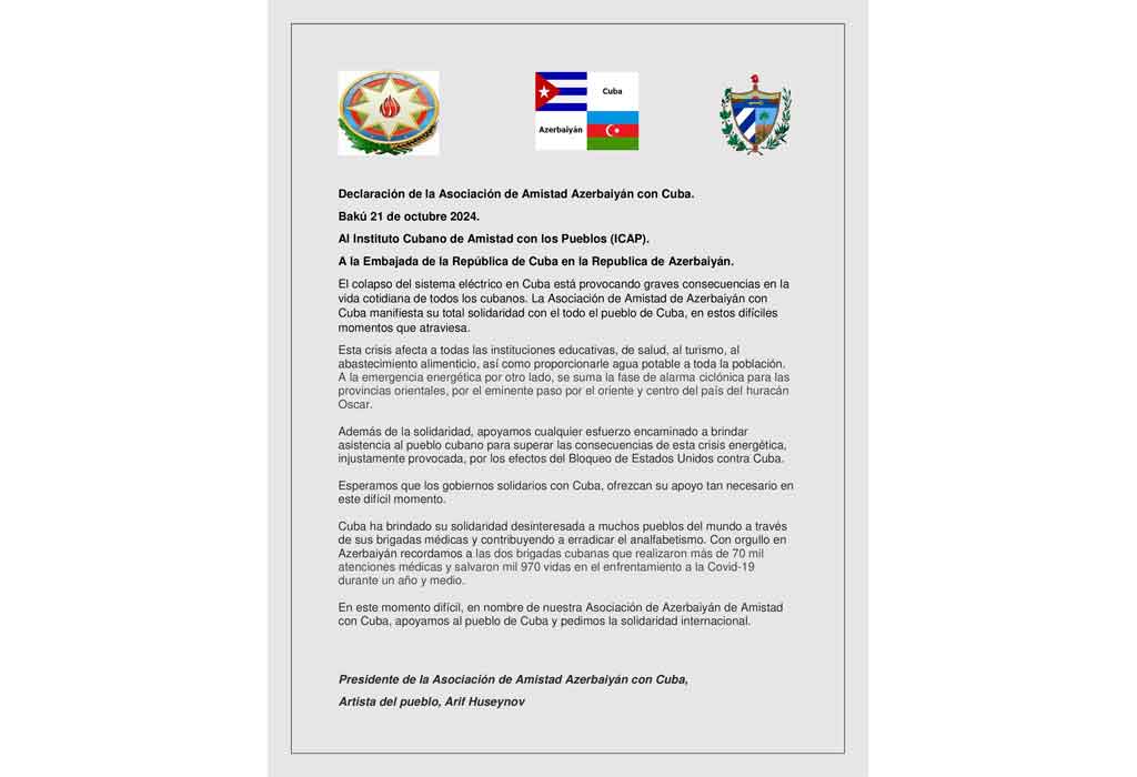 Esperamos que los gobiernos solidarios con Cuba, ofrezcan su apoyo tan necesario en este difícil momento, destacó el llamamiento de la Asociación azerbaiyana de solidaridad con la isla.