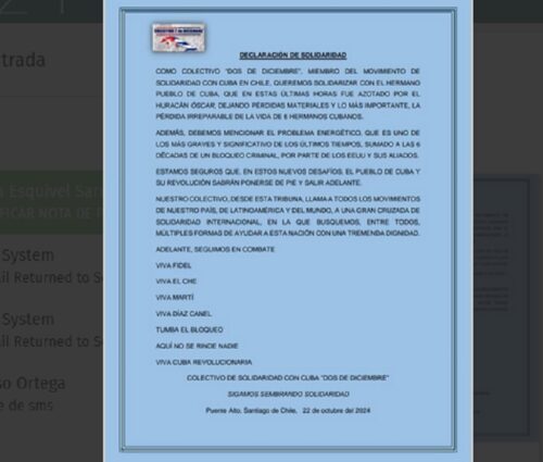 Santiago de Chile, 24 oct (Prensa Latina) El Colectivo Dos de Diciembre, de la comuna chilena de Puente Alto, expresó hoy su solidaridad con Cuba, ante la situación que enfrenta el país tras el paso del huracán Oscar y la reciente contingencia energética.