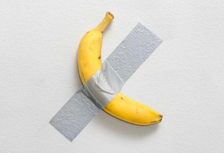 Desafiando los límites del arte contemporáneo, el icónico plátano creado en tres ejemplares, consiste en una banana fresca pegada con un trozo de cinta adhesiva.
