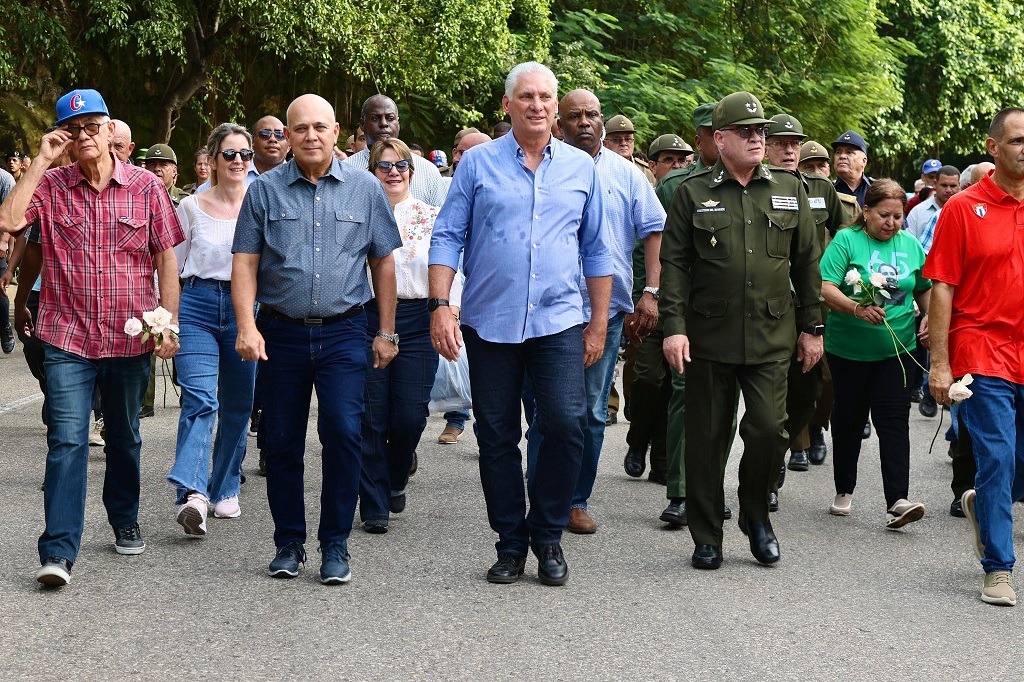 Este lunes, miles de estudiantes, trabajadores y otros funcionarios acompañaron a Díaz-Canel en la caminata para conmemorar el aniversario 65 del deceso de Camilo, que comenzó en la Plaza de la Revolución y concluyó en el Malecón habanero.