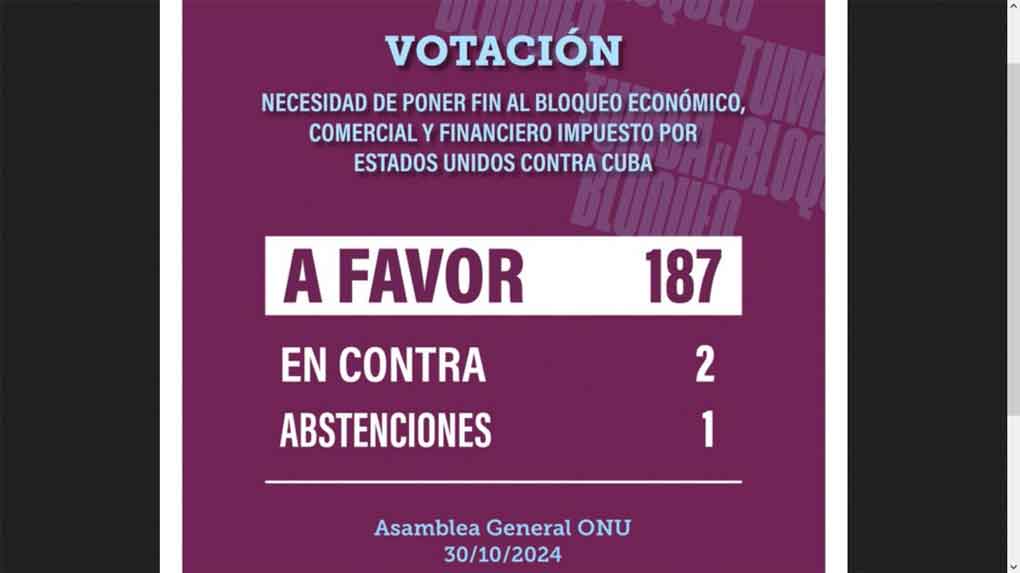 A su política de bloqueo contra el pueblo noble y solidario de Cuba, apuntó Díaz-Canel, el gobierno estadounidense añade una infamia adicional: «otra vez se hace acompañar en el voto negativo por Israel, el genocida de Gaza. Vergonzoso y doble prontuario criminal». A través de la red social, el primer ministro Manuel celebró la contundente victoria de la nación caribeña en la Asamblea General de las Naciones Unidas.