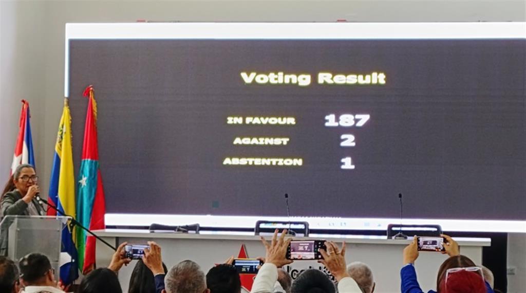 Tras dos días de discursos de la comunidad mundial contra la política de guerra estadounidense a La Habana, la Asamblea General de Naciones Unidas aprobó hoy con 187 votos a favor, dos en contra y una abstención la resolución que exige el cese del bloqueo de Estados Unidos.