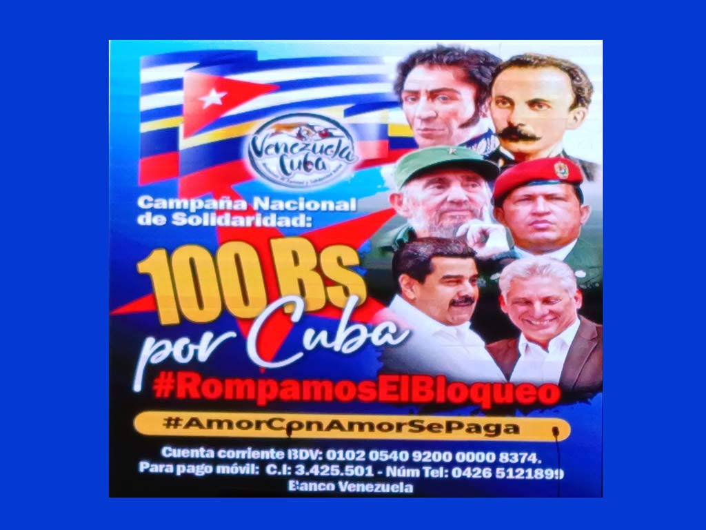 Esta iniciativa del Movimiento de Solidaridad y Amistad Mutua entre los dos países arrancó la víspera y busca rememorar la cruzada de 1958 denominada “La Marcha del Bolívar hacia la Sierra Maestra”, en la cual se llamó a cada venezolano a donar un bolívar para los barbudos. Así lo declaró en conversación con Prensa Latina el coordinador nacional del grupo solidario, Yhonny García, quien señaló que a modo de reedición, “quisimos llamar a esta “100bs por Cuba” por el significado histórico de entonces como lo es ahora”.