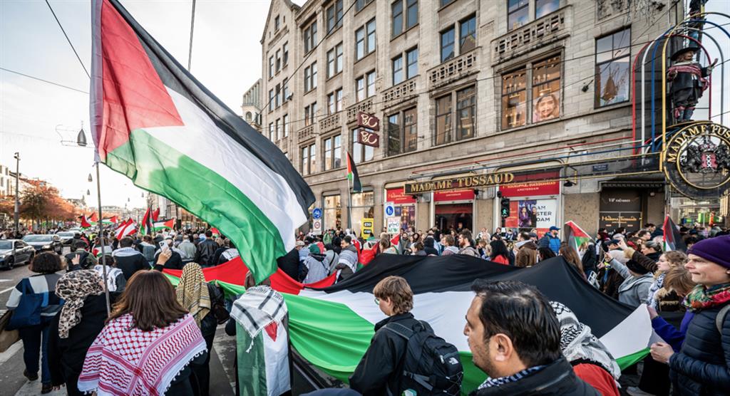 En Ámsterdam, cientos de personas se reunieron en la plaza Dam para protestar contra el genocidio en Gaza y la histórica Declaración Balfour de 1917, que facilitó la ocupación de Palestina.