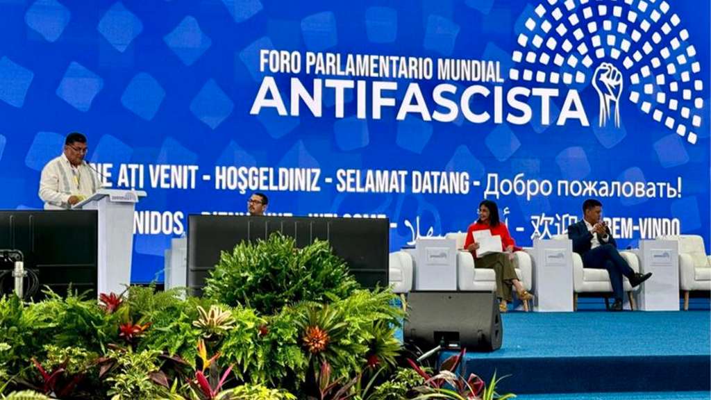 Destacó los retos que tienen los Parlamentos y manifestó la firme posición como foro antiimperialista y antifascista ante las perversiones del imperialismo y sus lacayos.