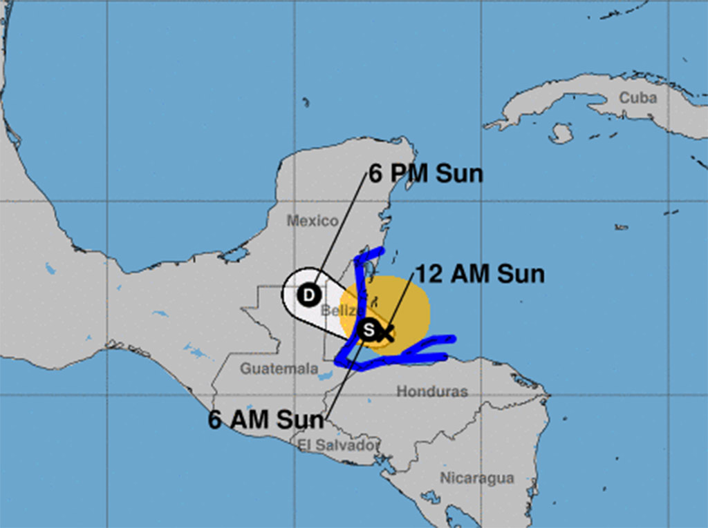 Un aviso del Servicio Meteorológico Nacional (SMN) refirió que a las 21:00 hora local su centro se localizaba a unos 145 km al sureste de Ciudad Belice, Belice, y a 245 km al sur-sureste de Chetumal, Quintana Roo, en el sur de México.