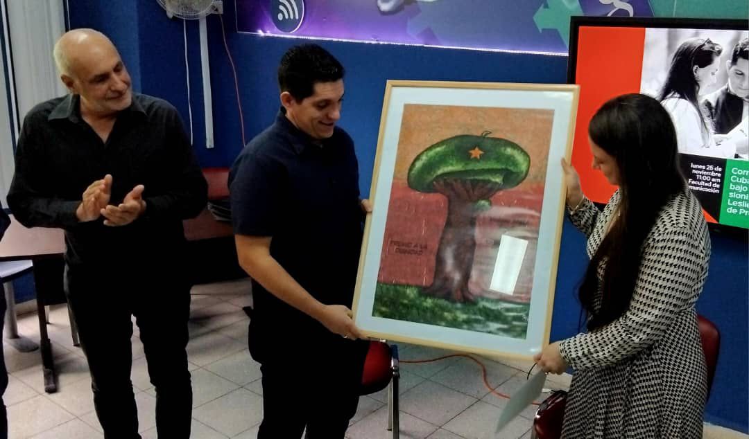 El presidente de la UPEC, Ronquillo Bello, entregó el reconocimiento a Masó y Alonso durante un conversatorio sobre sus experiencias en la cobertura de la agresión de Israel contra la Franja de Gaza y el Líbano, realizado en la Facultad de Comunicación de la Universidad de La Habana.