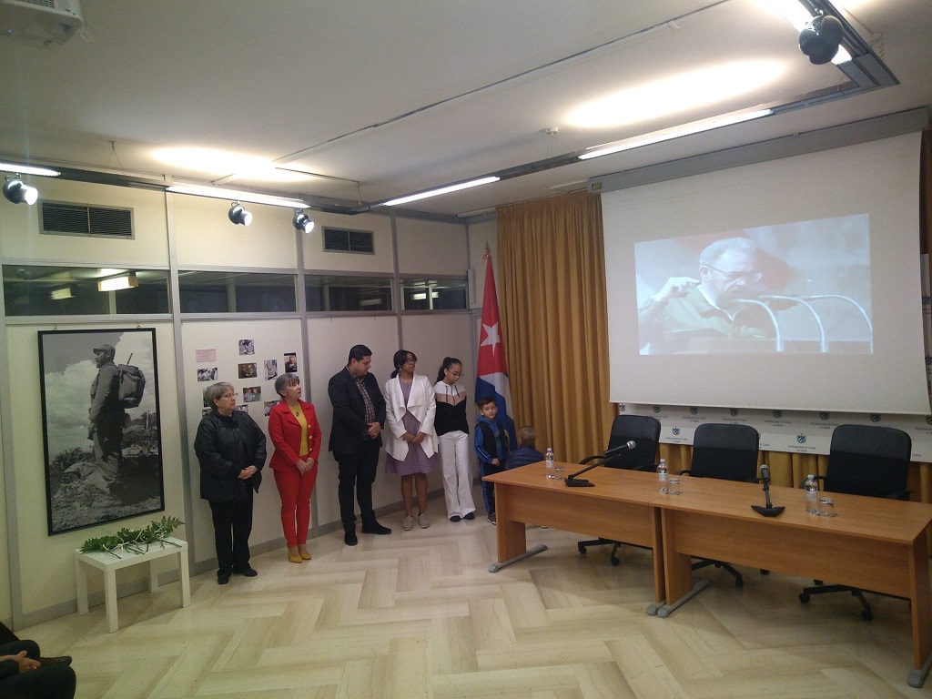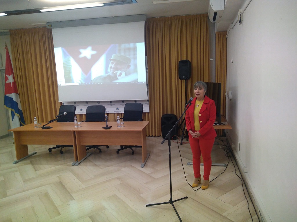 A las palabras de la jefa de la misión diplomática cubana, siguió la proyección del documental Fidel, la historia no contada, de la cineasta Estela Bravo, ovacionado por todos los asistentes.