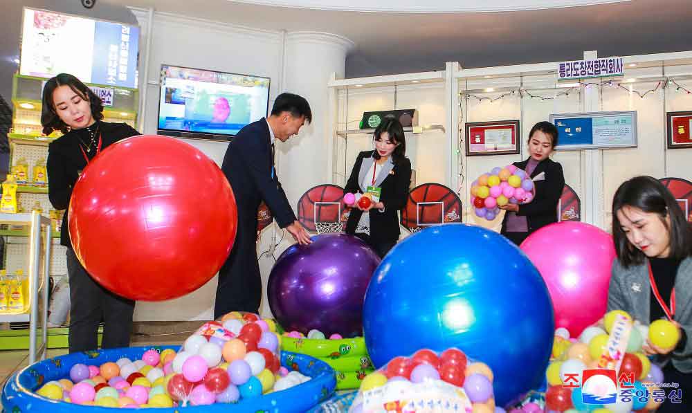 Se exhibieron en la feria más de 280 mil 800 mercancías de unas 680 variedades, entre ellas ropas infantiles, alimentos, calzados, juguetes y otros hechos por la Fábrica de Procesamiento de Trigo de Pyongyang, la Fábrica de Zapatos de Wonsan, la Fábrica de Artículos Plásticos de Uso Diario de Ex Militares Minusvalidos de Hamhung y la Sastrería Combinada del municipio Jung.