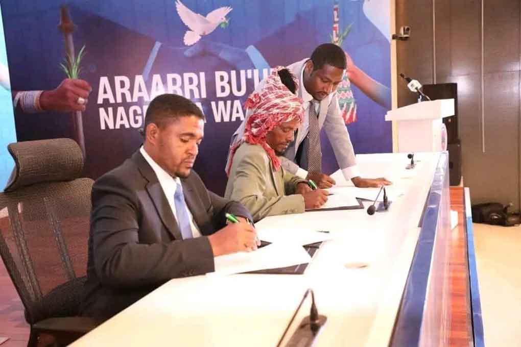 El convenio fue rubricado por el presidente de ese estado, Shimelis Abdisa, y el exlíder del OLA, Jaal Senay Negasa, con la presencia del jefe del Estado Mayor de las Fuerzas de Defensa Nacional etíopes, mariscal de campo Birhanu Jula, informó la Ethiopia News Agency.