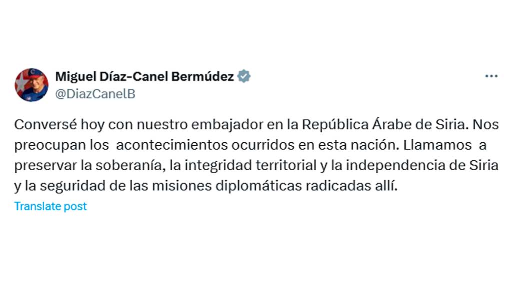 El mandatario hizo este llamado en un mensaje en la red social Twitter, en el cual expuso que conversó con el embajador cubano en Damasco, y expresó su preocupación por los acontecimiento que desembocaron la víspera con el derrocamiento del gobierno presidido por Bachar Al Asad.