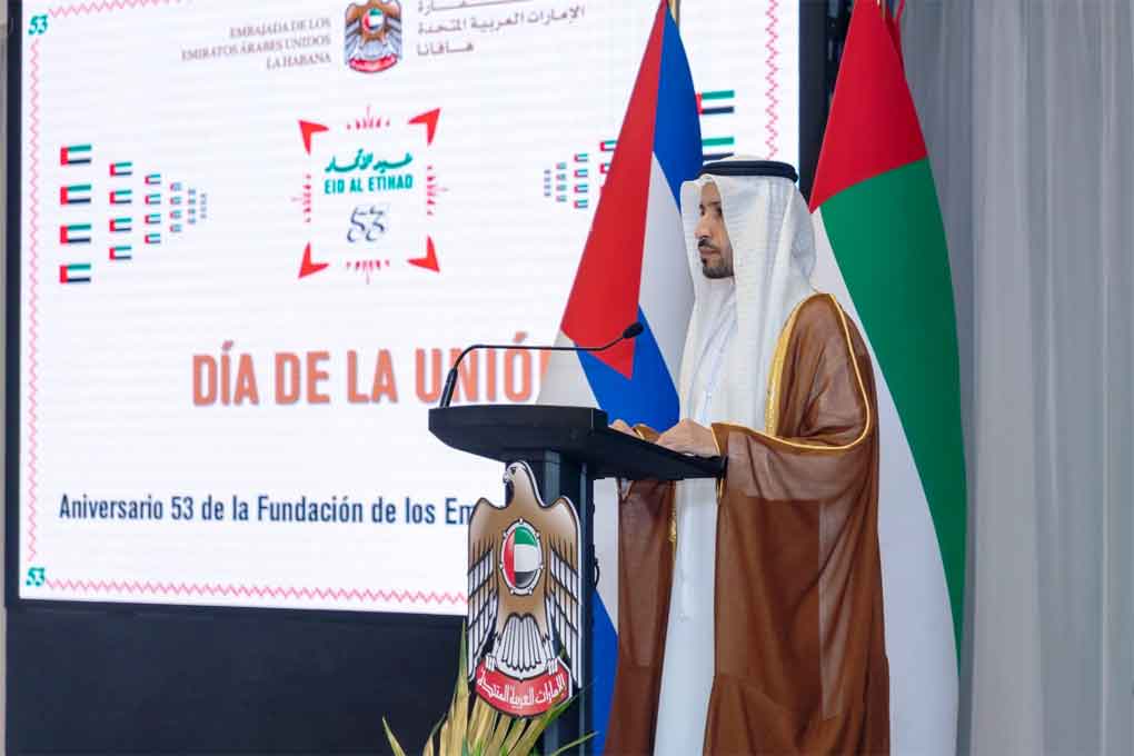 El jefe de Misión recordó en ceremonia para celebrar el aniversario 53 de la fundación como país de los EAU, la visita en noviembre de 2023 del Presidente Miguel Díaz-Canel a los Emiratos, la primera de un dignatario cubano, seguida por la del Primer Ministro Manuel Marrero en febrero de este año, que reforzaron los nexos bilaterales.