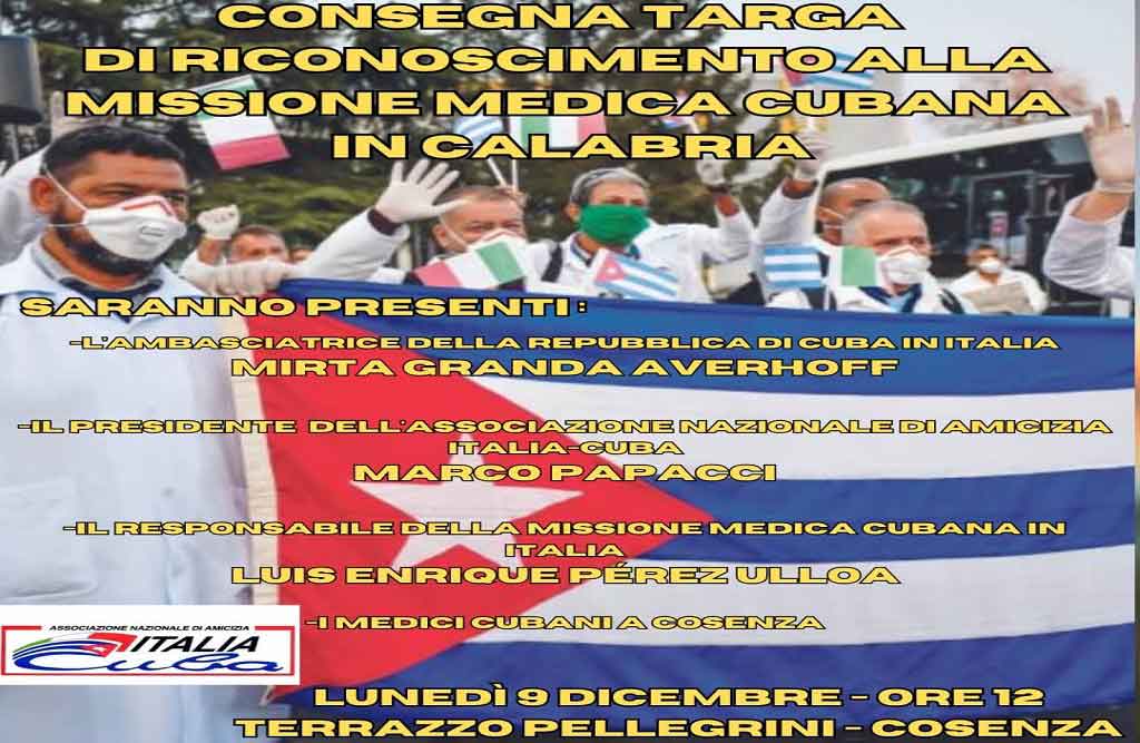 El acto, efectuado al mediodía de este lunes en los locales de Terrazzo Pellegrini, en la ciudad calabresa de Cosenza, fue presidido por la embajadora de Cuba en Italia, Mirta Granda, quien agradeció el noble gesto de esa asociación, al honrar el trabajo que realizan los especialistas sanitarios de la nación antillana.
