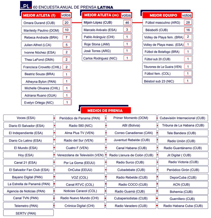Los medios de comunicación en todas sus variantes -radio, televisión, prensa escrita, agencias, portales digitales-, podrán enviar sus selecciones al correo deportes@prensa-latina.cu, desde donde se compilará la votación general.