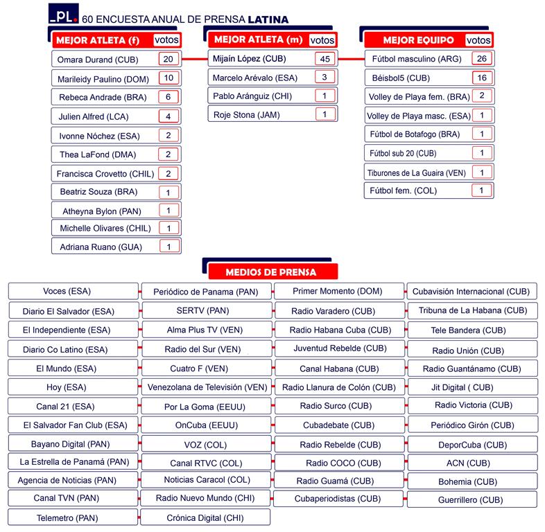 Mijaín añadió en las últimas horas los votos otorgados por Telémetro y el Sistema Estatal de Radio y Televisión de Panamá, Primer Momento (República Dominicana), Crónica Digital (Chile), el periódico Guerrillero y las emisoras de radio COCO y Guamá, los tres últimos medios cubanos.