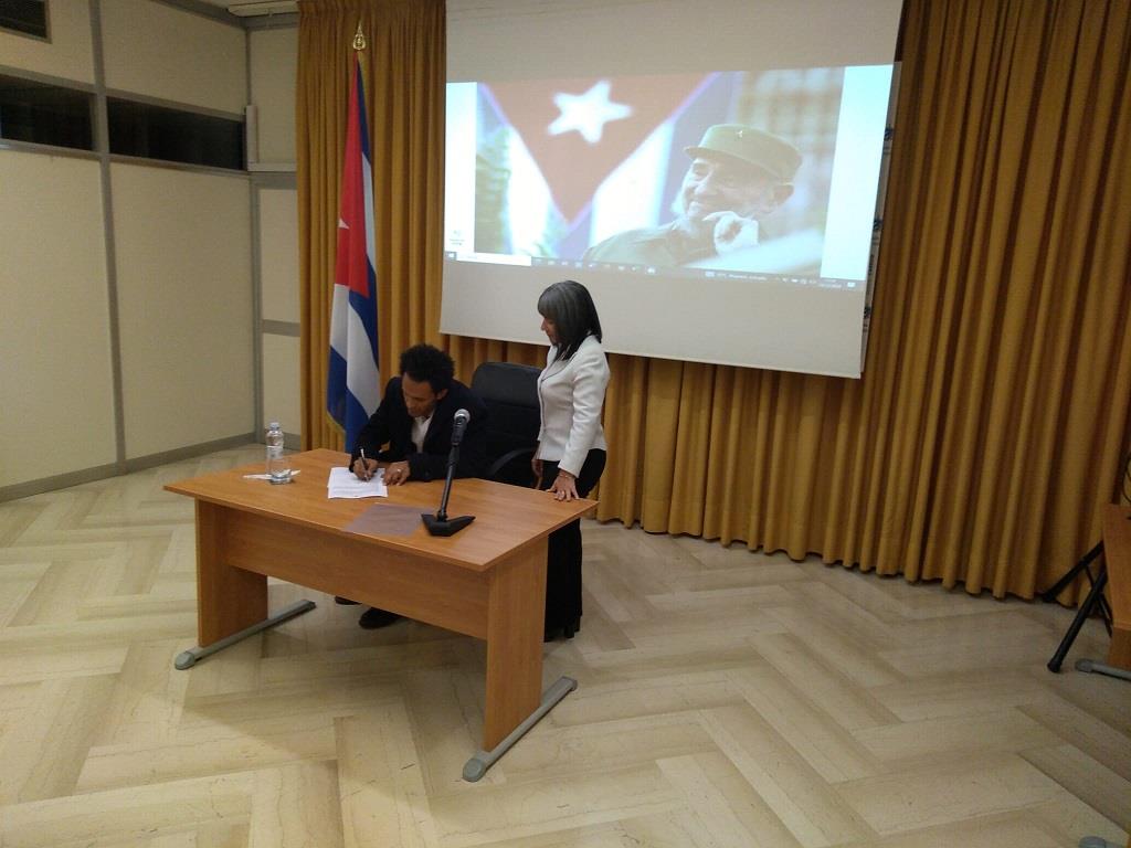 Durante el acto en que se formalizó la entrega de esta pintura, la embajadora Mirta Granda agradeció al artista por esta iniciativa en homenaje a la conmemoración, el próximo 1 de enero, de la victoria en 1959 de las fuerzas revolucionarias al mando del Comandante en Jefe, Fidel Castro.