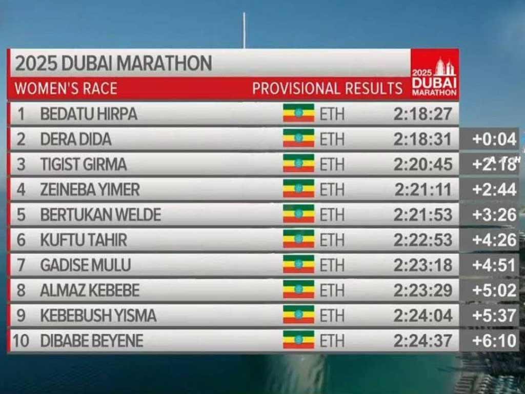 Addis Abeba, 12 ene (Prensa Latina) Los corredores de Etiopía ocuparon los diez primeros lugares tanto de la carrera masculina como la femenina en el Maratón de Dubái, Emiratos Árabes Unidos, destacó hoy Fana Broadcasting Corporate.