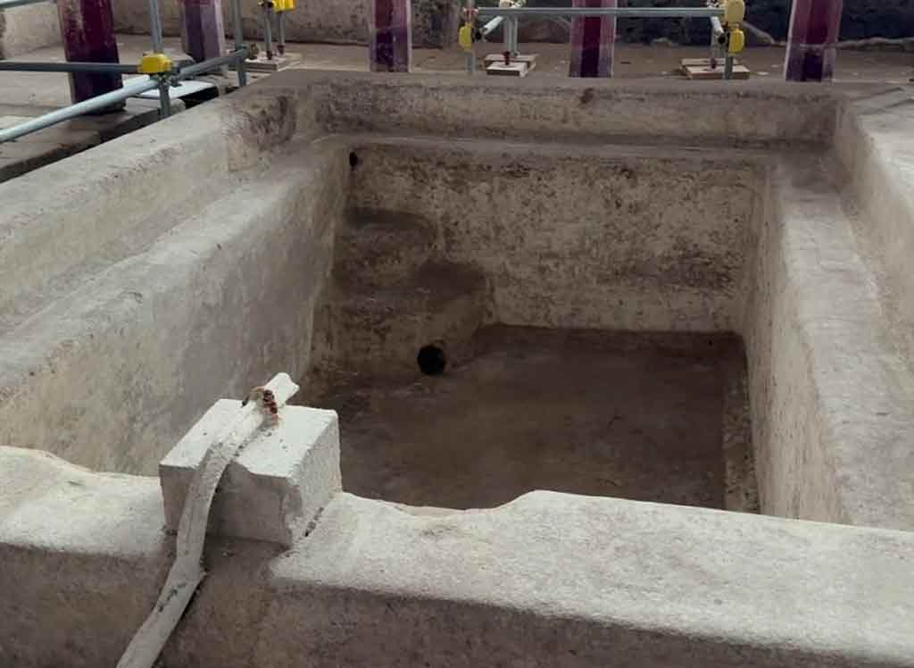 Estos baños recién descubiertos se ubican cerca de una sala de banquetes, que podía albergar hasta treinta personas a juzgar por las sillas presentes, y en particular es impresionante el peristilo que forma parte de los mismos, con un patio porticado de unos 100 metros cuadrados, en cuyo centro se encuentra una gran piscina de agua fría.