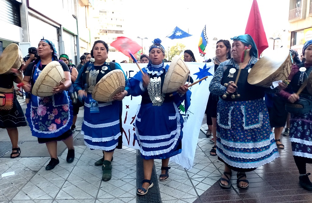 Representantes de comunidades indígenas y organizaciones sociales participaron en la marcha, que partió frente a la Universidad de Chile, se dirigió hasta la Plaza de Armas y luego siguió su recorrido por varias calles de esta capital.
