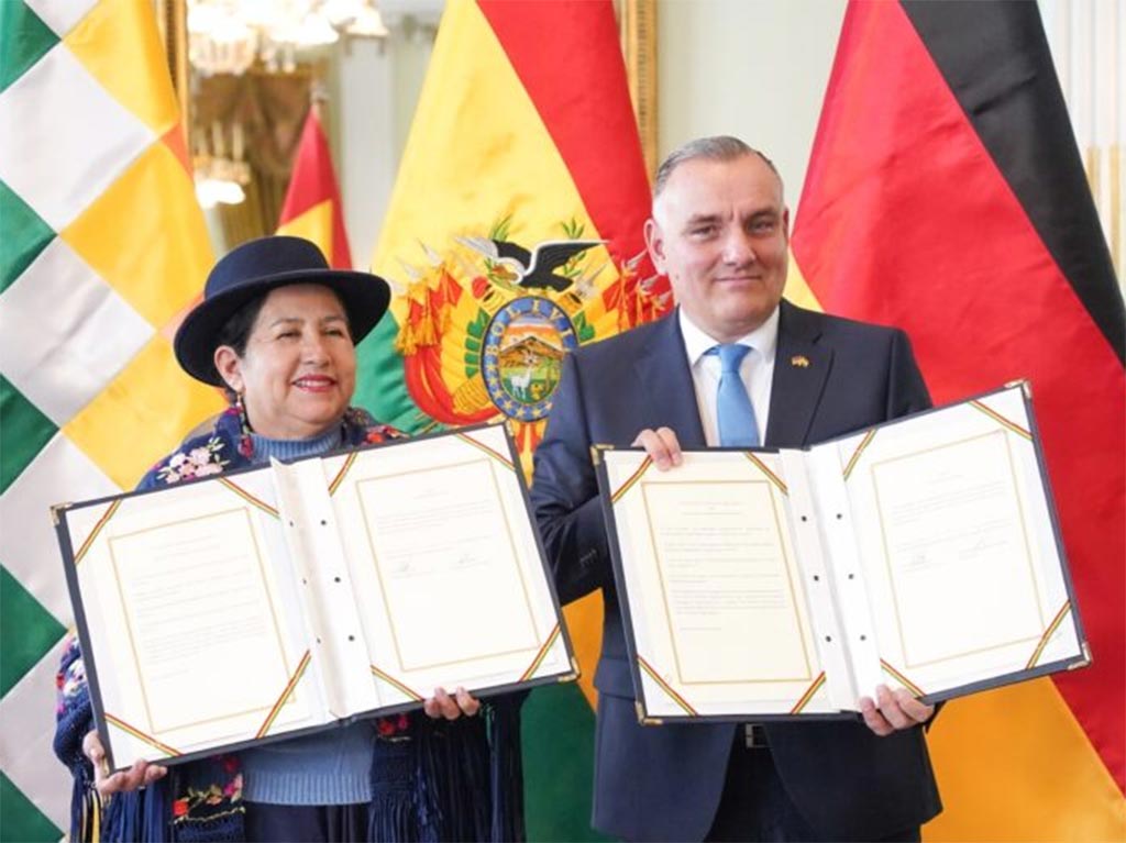 La ministra de Relaciones Exteriores, Celinda Sosa, y el embajador de Alemania en Bolivia, José Schulz, presentaron los tres convenios en materia de cooperación, cuyo propósito es visibilizar el trabajo conjunto que fortalecerá la transición energética y la protección de la Amazonía.
