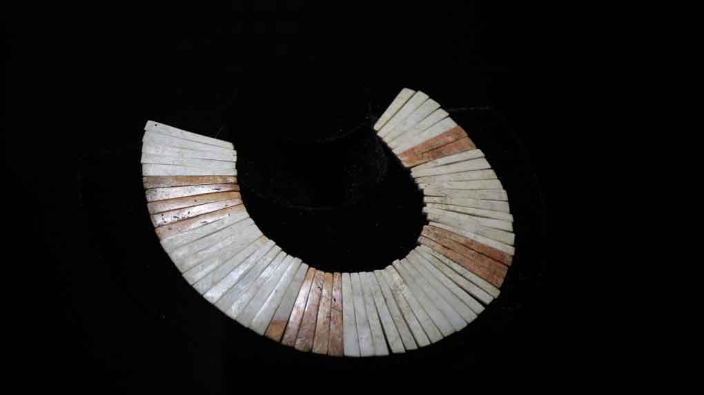 Llevaba consigo un collar de cuentas de ostras espinosas del género Spondylus, de colores blanco y naranja. Las alhajas fabricadas con esta concha simbolizan la alta jerarquía social de sus portadores; luego fueron reemplazadas por piezas de orfebrería como símbolo predilecto de alto rango en las sociedades indígenas precolombinas.
