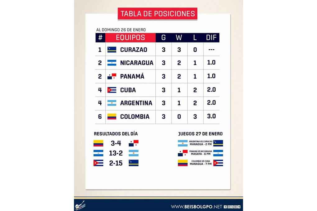 Para hoy están progranados los desafíos Argentina-Curazao y Colombia-Cuba en el capitalino Estadio Nacional Soberanía y el de Panamá-Nicaragua en el Roberto Clemente de Masaya.