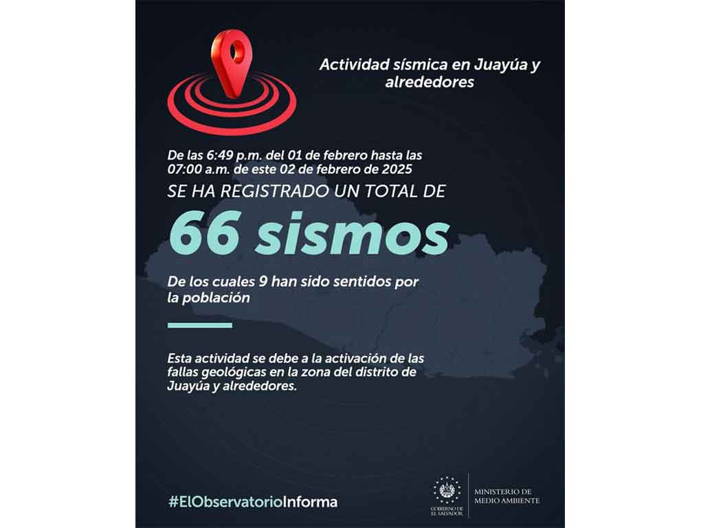 Un informe de la entidad precisó que los movimientos telúricos ocurrieron en el distrito de Juayúa, departamento de Sonsonate (oeste), y sus alrededores, a partir de las 18:49, hora local, del sábado 1 de febrero, hasta las 07:00 (hora local) de este domingo.
