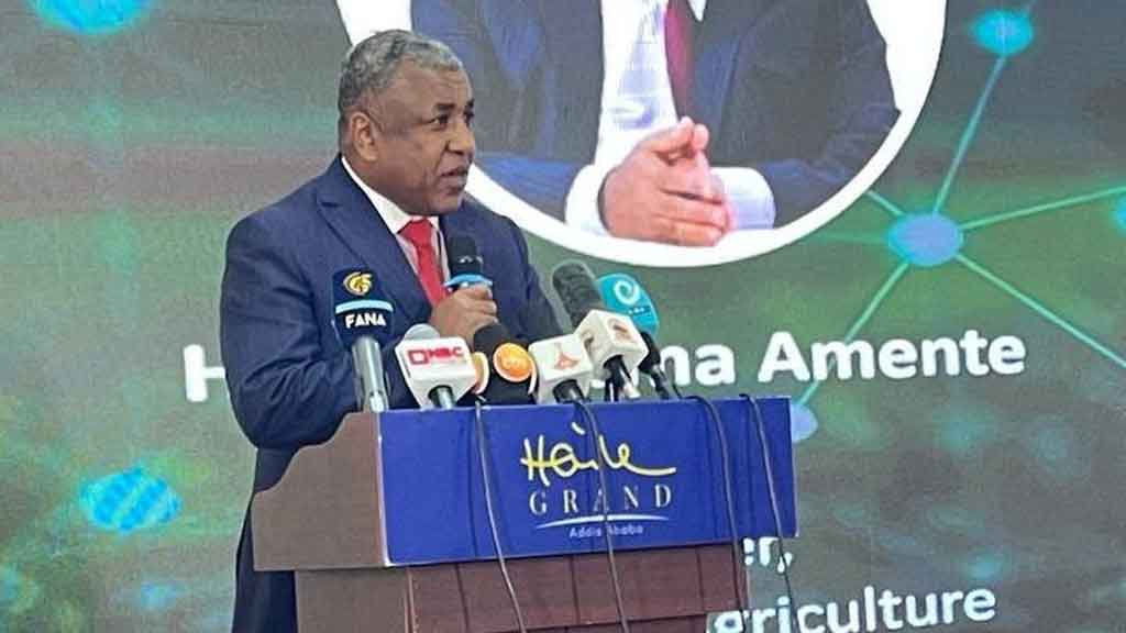 Los ministros de Agricultura, Girma Amente, de Innovación y Tecnología, Belete Molla, el director general del ATI, Mandefro Nigusse, y otros altos funcionarios gubernamentales participaron en la presentación.