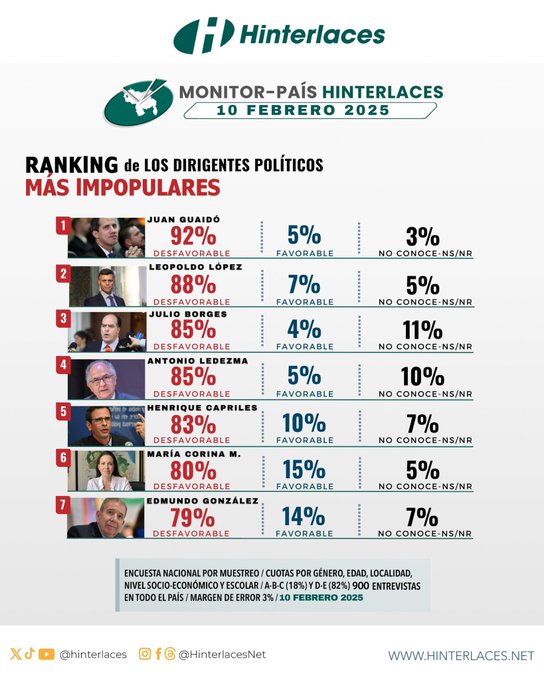 De estos políticos opositores venezolanos solo Capriles y Machado viven en el país, mientras el resto residen en el exterior, desde donde mantienen los ataques y planes desestabilizadores contra la Revolución bolivariana. En enero pasado otro estudio de Hinterlaces reveló que el 93 por ciento de los venezolanos encuestados estimaron que Machado y González mintieron al país sobre la posibilidad de que este último asumiría la presidencia del país, pese a los resultados del proceso electoral del 28 de julio.