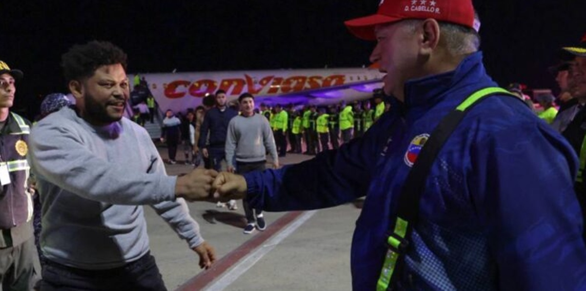 Transmitido en vivo por Venezolana de Televisión durante el programa nocturno Con Maduro +, Cabello recibió uno a uno a los migrantes y por breves minutos compartió con ellos en la cabina de la aeronave.