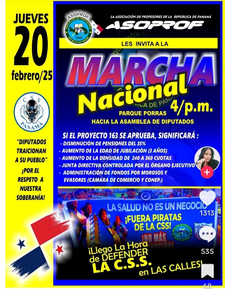 En ese sentido convocó a todos los panameños patriotas a sumarse a una marcha el próximo jueves que partirá desde el emblemático parque Belisario Porras, en esta capital, hasta as inmediaciones del Legislativo para reiterar sus reclamos de justicia y demandar se retire el poryecto de ley sobre la seguridad social que atenta contra los intereses de los trabajadores y sus familiares.
