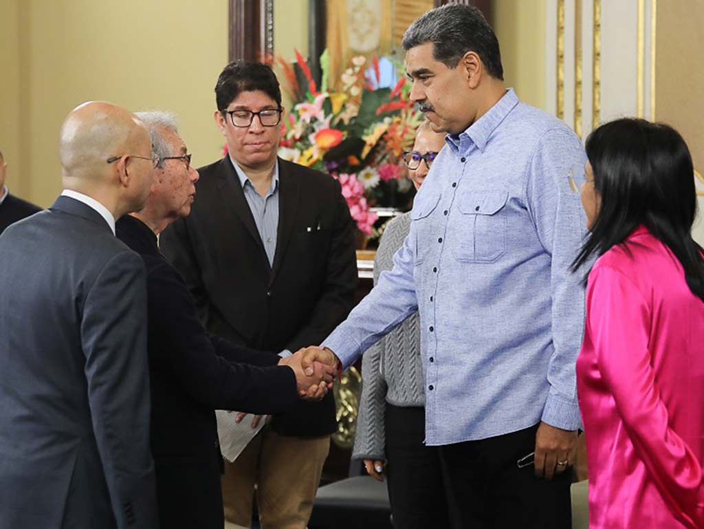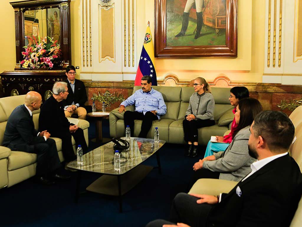 Un reporte de Venezolana de Televisión mostró el momento en que el mandatario dio la bienvenida al visitante y su comitiva en el Palacio de Miraflores, sede del Gobierno, en compañía de la primera combatiente y diputada Cilia Flores, la vicepresidenta ejecutiva Delcy Rodríguez, y otras autoridades.