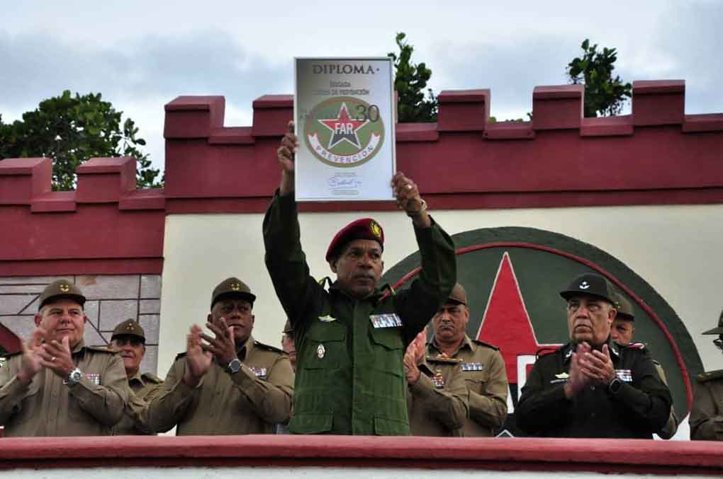 En ese contexto, el titular del Minfar entregó un diploma de reconocimiento a la unidad militar firmado por el líder del proceso revolucionario, así como el carnet de militantes del Partido Comunista y de la Unión de Jóvenes Comunistas a oficiales, sargentos y soldados.