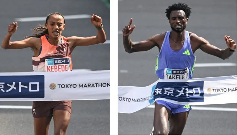 Takele, de 22 años, sorprendió con un registro personal de 2:03.23 horas, mientras Kebede, que tuvo todo el tiempo el mando de la carrera, repitió el triunfo de la versión pasada con crono de 2:16.31.