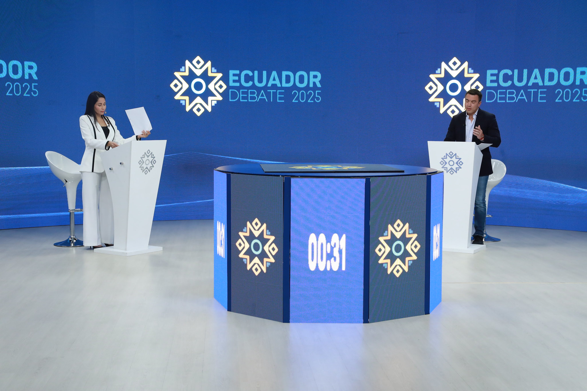 «Lo que diga el candidato Noboa es mentira y no lo va a cumplir», así arrancó González su primera intervención en el careo, mientras su oponente afirmó que no iba a “defender cuentos viejos, de la narcopolítica y la corrupción».