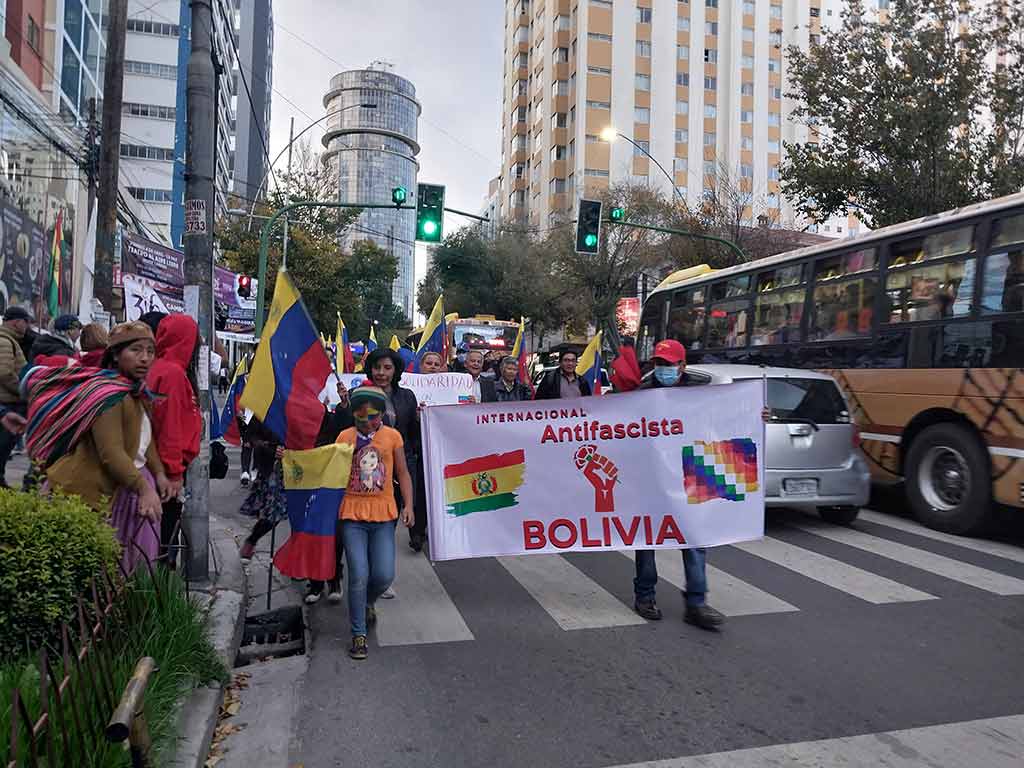 La Paz, 25 mar (Prensa Latina) La Internacional Antifascista Capítulo Bolivia reafirmó hoy su solidaridad con Venezuela y 238 migrantes de esa nacionalidad deportados hacia El salvador, ante un fuerte dispositivo policial cerca de la embajada de Estados Unidos.