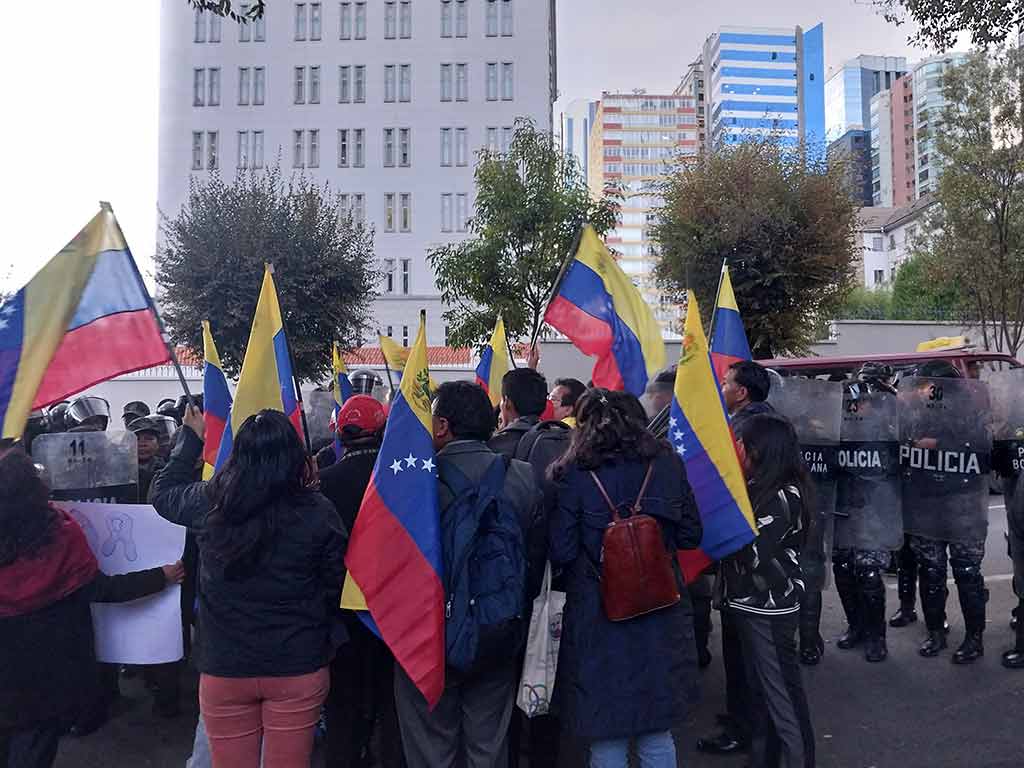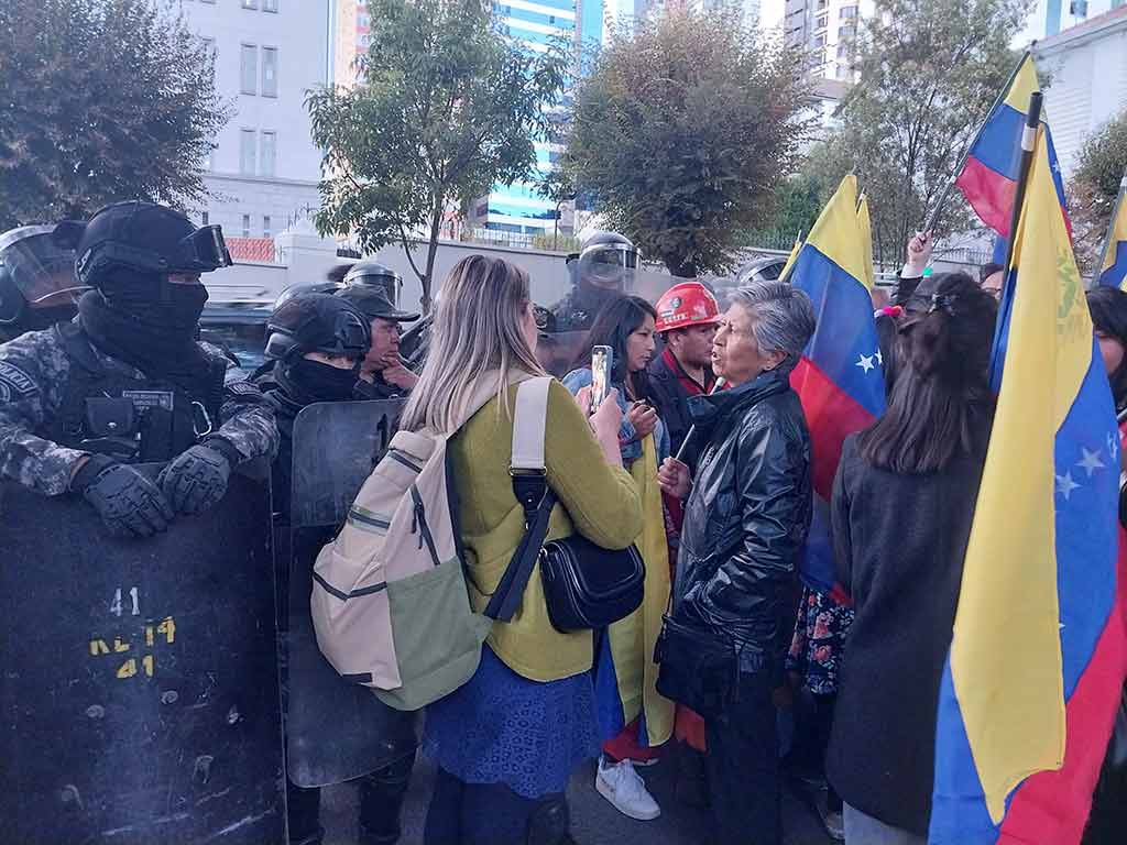 Esa situación provocó una confrontación, que fue saldada en la acera opuesta a la sede diplomática en la paceña avenida Arce, después que la exministra de Salud (2006-2008, 2010-2012) Nila Heredia se dirigió a los miembros del cuerpo armado.