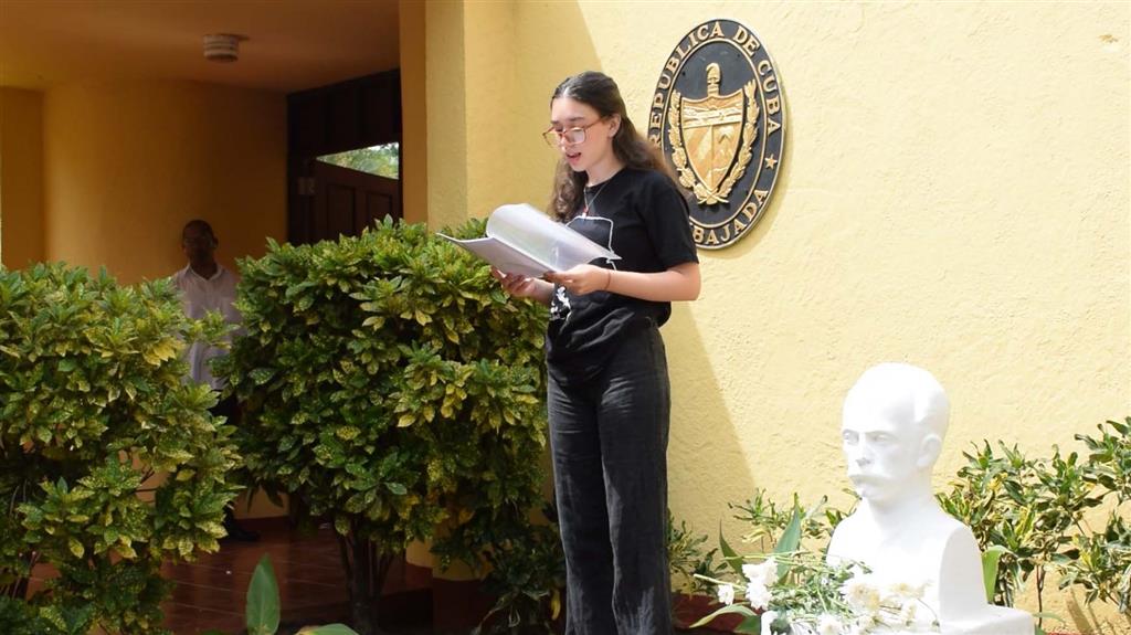 Como parte de la actividad los más pequeños de la misión estatal depositaron flores blancas ante el busto de José Martí, las niñas Amira y Anngie declamaron el poema ¡Oh mi adorada niña! del nicaragüense Rubén Darío, mientras el trovador Alejandro Guillén, interpretó “Quién Fuera” y “Playa Girón”, de Silvio Rodríguez.