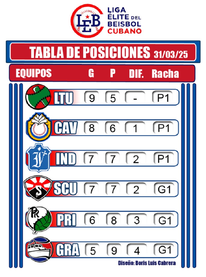 Después de estos resultados Las Tunas sigue a la cabeza con balance de 9-5, seguido por Ciego de Ávila (8-6), Industriales y Santiago de Cuba (7-7), Pinar del Río (6-8) y Granma (5-9).