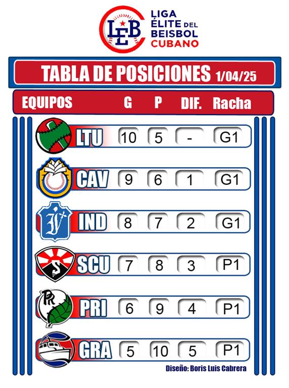 Después de estos resultados Las Tunas sigue al frente con 10 éxitos y cinco fracasos, seguido por Ciego de Ávila (9-6), Industriales (8-7), Santiago de Cuba (7-8), Pinar del Río (6-9) y Granma (5-10).