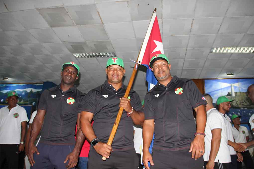 El receptor Yosvani Alarcón, junto a su hermano Yordanis y Héctor Castillo, recibió la bandera cubana de manos de Osvaldo Vento, presidente del Instituto Nacional de Deportes, Educación Física y Recreación (Inder), en una ceremonia breve pero emotiva.