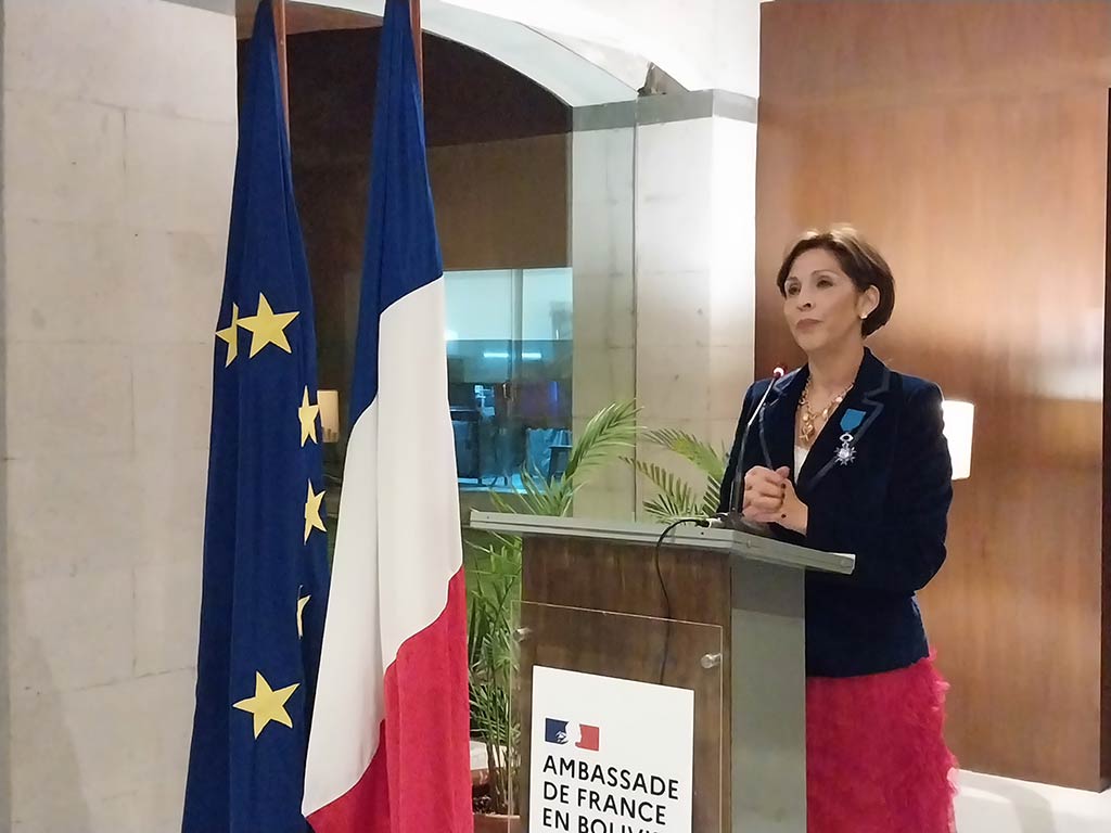 Durante la velada realizada en la residencia de la embajadora en La Paz, Roos explicó que esa decisión se tomó a propuesta del señor Jean-Noël Barrot, ministro para Europa y de Asuntos Exteriores de la República Francesa.