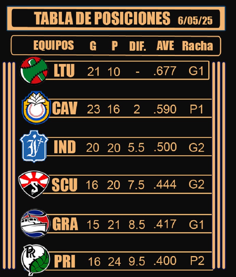 Les siguen Santiago de Cuba (16-20) y Granma (15-21), en pugna por el último puesto a los playoffs y Pinar del Río (16-24), que ya terminó su accionar y espera por un milagro.