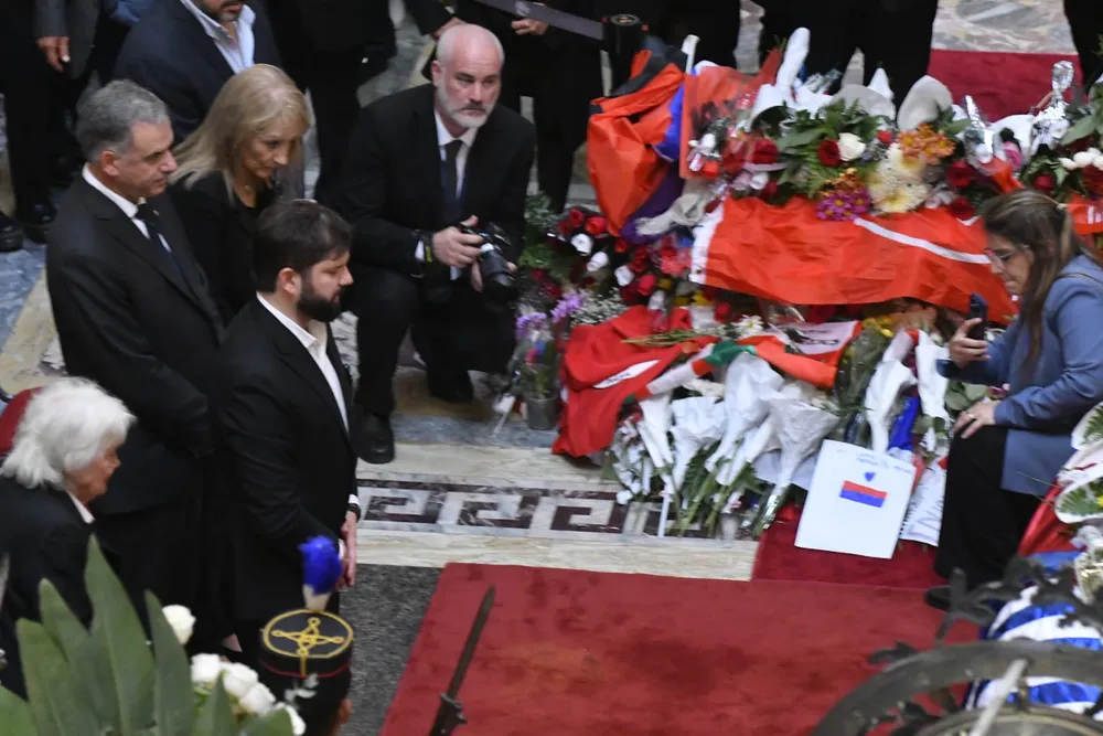 Gabriel Boric puso sus manos sobre el féretro de Mujica, cubierto por la bandera soleada de Uruguay, en señal de homenaje.