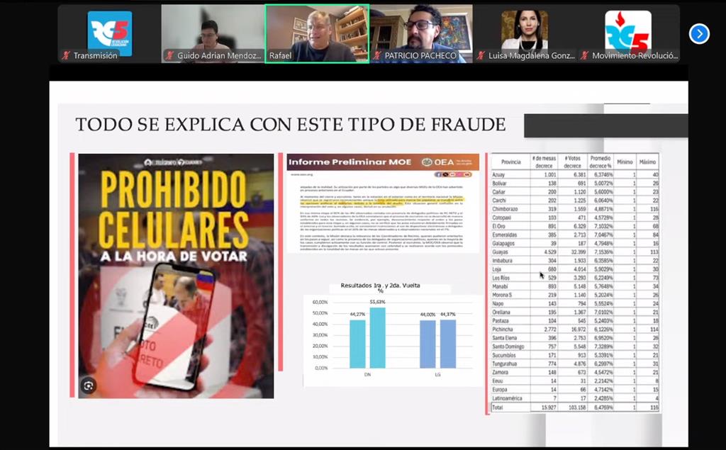 Una de ellas, de la empresa Fara Veggetti, con dos mil 400 casos presenciales y margen de error de dos por ciento, mostró un empate técnico entre Noboa y González, o sea, que “ni siquiera con el margen de error se alcanza el resultado oficial de 11 puntos de diferencia”. Mencionó que en 15 mil 927 mesas de votación en lugar de aumentar el apoyo a la candidata de la RC en comparación con la primera vuelta, hubo una disminución y “electoralmente es imposible”.