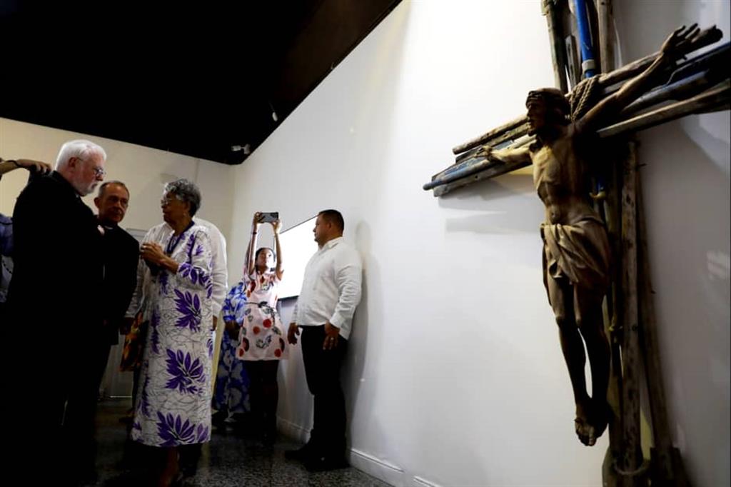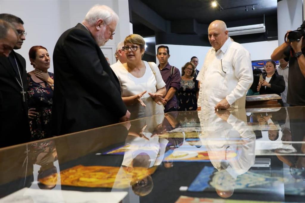 El ministro entregó al secretario para las Relaciones con los Estados del Vaticano un ejemplar del libro que celebra la obra de la Premio Nacional de Artes Plásticas y curadora de la muestra Lesbia Vent Dumois.