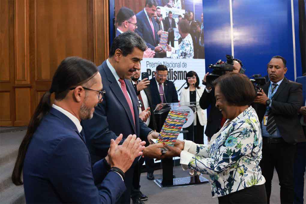 En acto desde el Salón Ayacucho del Palacio de Miraflores, sede del Gobierno, en compañía de los ministros de Comunicación e Información, Freddy Ñáñez, y de Cultura, Ernesto Villegas, Maduro gratificó con una placa a los galardonados que recibió, en primer lugar, la periodista Helena Salcedo.