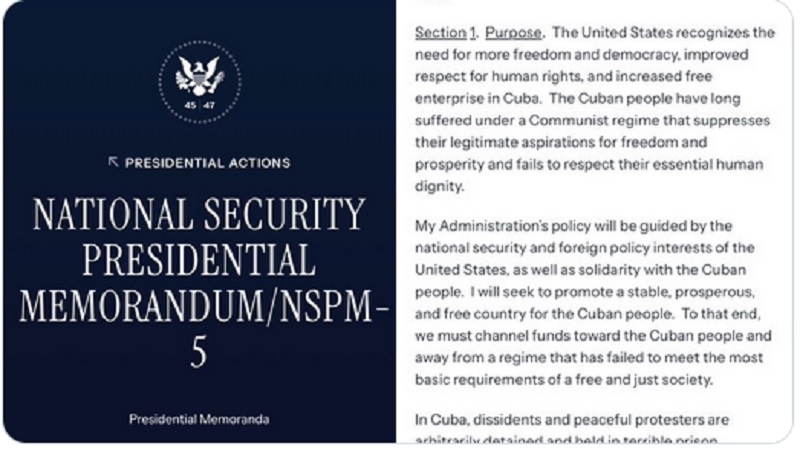 Rodríguez escribió que el memorando presidencial de Trump contra Cuba refuerza la agresión y el bloqueo económico para castigar al pueblo cubano, señaló Colombo Times.