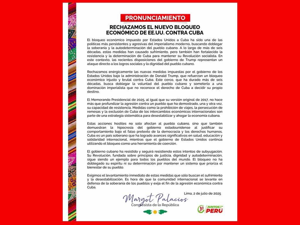 En ese contexto, prosiguió, las recientes disposiciones del gobierno de Trump, anunciadas el martes último, representan un ataque directo a los logros sociales y la dignidad del pueblo cubano.